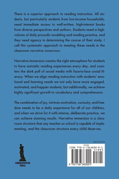 There is a superior approach to reading instruction. All students, but particularly students from low-income households, need immediate access to well-written, high-interest books from diverse perspectives and authors. Students need a high-volume of daily prosodic modeling and reading practice, and they need agency in determining the course of their study. I call this systematic approach to meeting these needs in the classroom narrative immersion. Narrative immersion creates the right atmosphere for students to have autotelic reading experiences every day, and counters the dark pull of social media with face-to-face social literacy. When we align reading instruction with students' emotional and learning needs we not only have more engaged, motivated, and happier students; but additionally, we achieve highly significant growth in vocabulary and comprehension. The combination of joy, intrinsic motivation, curiosity, and freedom needs to be a daily experience for all of our children, and when we strive for it with intense, deliberate practice, we can achieve stunning results. Narrative immersion is a classroom structure that any teacher or school is capable of implementing, and the classroom structure every child deserves.