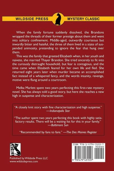 When the family fortune suddenly dissolved, the Brandons wrapped the threads of their former prestige about them and went into solitary confinement. Middle-aged, outwardly courteous but inwardly bitter and hateful, the three of them lived in a state of suspended animosity, pretending to ignore the fear that hung over them. This was the family that greeted Elizabeth when, in her youth and naivete, she married Thayer Brandon. She tried sincerely to fit into the curiously distraught household, but fear is contagious, and the time came when Elizabeth feared for her own life and fled. She returned eight years later when murder became an accomplished fact instead of a whispered fancy, and the words insanity, revenge, motive were flung around a courtroom. Melba Marlett spent two years perfecting this first-rate mystery novel. She has always told a good story, but here she reaches a new high in suspense and characterization. "A closely knit story with fine characterization and high suspense." -Indianapolis Star "The author spent two years perfecting this book with highly satisfactory results. There will be a waiting list for this in your family." -Baltimore Sun "Recommended by fans to fans." -The Des Moines Register