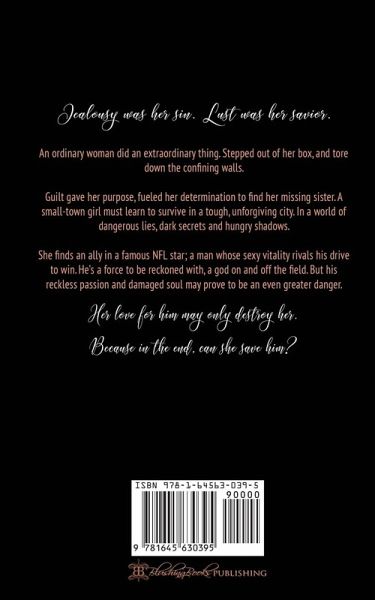 Jealousy was her sin. Lust was her savior. An ordinary woman did an extraordinary thing. Stepped out of her box and tore down the confining walls. Guilt gave her purpose, fueled her determination to find her missing sister. A small-town girl must learn to survive in a tough, unforgiving city. In a world of dangerous lies, dark secrets and hungry shadows. She finds an ally in a famous NFL star; a man whose sexy vitality rivals his drive to win. He’s a force to be reckoned with, a god on and off the field. But his reckless passion and damaged soul may prove to be an even greater danger. Her love for him may only destroy her. Because in the end, can she save him?