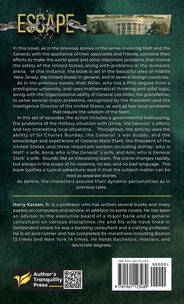 In this novel, as in the previous stories in the series involving Matt and the General, with the assistance of their associates and friends, combine their efforts to make the world good and solve important problems that involve the safety of the United States, along with problems in the domestic arena. In this instance, the book is set in the beautiful area of middle New Jersey, the United States in general, and in several foreign countries. As in the previous novels, Matt Miller, who has a PhD degree from a prestigious university, and uses mathematical thinking and solid logic, along with the organizational ability of General Les Miller, his grandfather, to solve several major problems, recognized by the President and the Intelligence Director of the United States, as well as two local problems that require the wisdom of the team. In this set of episodes, the action includes a governmental kidnapping, the problems of the military situation with China, the General's affairs, and two interesting local situations. Throughout, the activity uses the ability of Sir Charles Bunday, the General's war buddy, and the knowledge and experience of General Mark Clark, the President of the United States, and three important women including Ashley, who is Matt's wife, Anna, who is the General's wife, and Ann, who is General Clark's wife. Sounds like an interesting team. The scene changes rapidly, but always in the scope of no violence, no sex, and no bad language. The book typifies a typical adventure read in that the subject matter can be read as separate stories.As before, the characters assume their dynamic personalities as in previous tales.