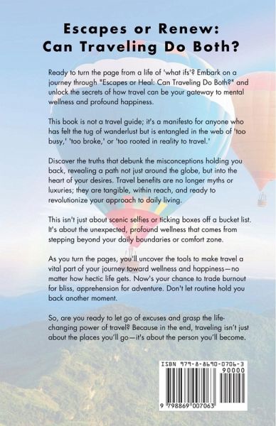 Ready to turn the page from a life of 'what ifs'? Embark on a journey through "Escapes or Renew: Can Traveling Do Both?" and unlock the secrets of how travel can be your gateway to mental wellness and profound happiness. This book is not a travel guide; it's a manifesto for anyone who has felt the tug of wanderlust but is entangled in the web of 'too busy,' 'too broke,' or 'too rooted in reality to travel.' Discover the truths that debunk the misconceptions holding you back, revealing a path not just around the globe, but into the heart of your desires. Travel benefits are no longer myths or luxuries; they are tangible, within reach, and ready to revolutionize your approach to daily living. This isn't just about scenic selfies or ticking boxes off a bucket list. It's about the unexpected, profound wellness that comes from stepping beyond your daily boundaries or comfort zone. As you turn the pages, you'll uncover the tools to make travel a vital part of your journey toward wellness and happiness-no matter how hectic life gets. Now's your chance to trade burnout for bliss, apprehension for adventure. Don't let routine hold you back another moment. So, are you ready to let go of excuses and grasp the life-changing power of travel? Because in the end, traveling isn't just about the places you'll go-it's about the person you'll become.