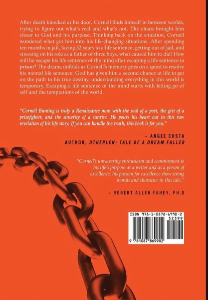 After escaping a prison sentence, Cornell Bunting finds himself in a complicated time, as he died for sixteen minutes. After death knocked at his door, Cornell finds himself in between worlds, trying to figure out what's real and what's not. The chaos brought him closer to God and his purpose. Thinking back on the situation, Cornell wondered what got him into his life-changing situations. After spending ten months in jail, facing 32 years to a life sentence, getting out of jail, and stressing on his role as a father of three boys, what caused him to die? How will he escape his life sentence of the mind after escaping a life sentence in prison? The drama unfolds as Cornell's memory goes on a quest to resolve his mental life sentence. God has given him a second chance at life to get on the path to his true destiny, understanding everything in this world is temporary. Escaping a life sentence of the mind starts with letting go of self and the temptations of the world.