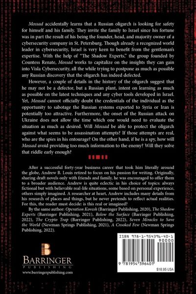 Mossad accidentally learns that a Russian oligarch is looking for safety for himself and his family.They invite the family to Israel since his fortune was in part the result of his being the founder, head, and majority owner of a cybersecurity company in St. Petersburg. Though already a recognized world leader in cybersecurity, Israel is very keen to benefit from the gentleman's expertise. With the help of "The Shadow Experts" the group founded by Countess Renate, Mossad works to capitalize on the insights they can gain into Visla Cybersecurity, all the while trying to postpone as much as possible any Russian discovery that the oligarch has indeed defected. However, a couple of details in the history of the oligarch suggest that he may not be a defector, but a Russian plant, intent on learning as much as possible on the latest techniques and any cyber tools developed in Israel. Yet, Mossad cannot officially doubt the credentials of the individual as the opportunity to sabotage the Russian systems exported to Syria or Iran is potentially too attractive. Furthermore, the onset of the Russian attack on Ukraine does not allow the time which one would need to evaluate the situation as much as desired. Will Mossad be able to protect the oligarch against what seems to be assassination attempts? If those attempts are real, who are the spies in his entourage? On the other hand, if he is a spy, how will Mossad avoid providing too much information to the enemy? Will they solve that riddle early enough?