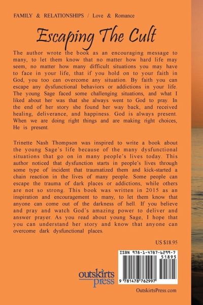 The author Trinette Nash Thompson wrote the book as an encouraging message to many, to let them know that no matter how hard life may seem, no matter how many difficult situations you may have to face in your life, that if you hold on to your faith in God you too can overcome any situation, dysfunctional behaviors or, addictive behavior in your life. Just like the young Sage faced some challenging situations what I liked about her is that she always went to God to pray and in the end of her story she found her way back and received healing, deliverance, love and happiness. God is always present rather we are always doing right things are making right choices he is present. Escaping The Cult is a book that is encouraging, inspirational, it is a book you buy for yourself, your family, your friends, and this book truly captivates and draws people together in love and harmony.