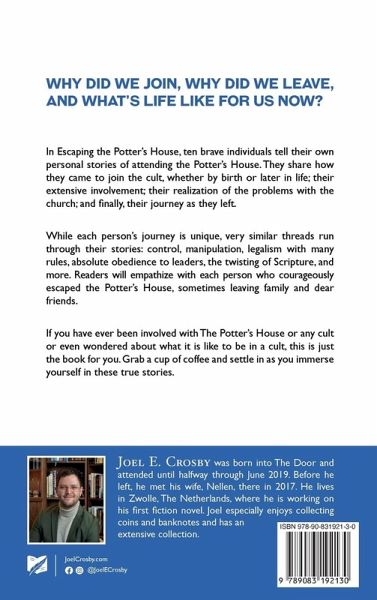 Ever wondered what it's like to escape from a cult? Curious about the personal stories of those who've lived through it? Escaping the Potter's House will take you on a riveting journey through the lives of ten brave individuals who broke free. ¿¿¿¿¿¿¿Discover firsthand accounts of those who joined the Potter's House, whether by birth or later in life. Learn about the deep involvement, control, and manipulation experienced within the church. Understand the pivotal moments when each person realized the problems with the Potter's House. Follow their courageous journeys as they navigated the challenges as they left the cult. Empathize with their struggles as they left behind family and friends and reclaimed their lives. Whether you've been involved with the Potter's House, any other cult, or are simply curious about life within these closed communities, Escaping the Potter's House offers compelling and eye-opening narratives.