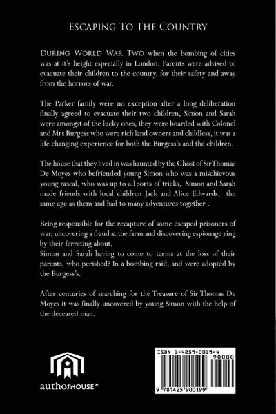 During World War Two when the bombing of cities was at it's height especially in London, Parents were advised to evacuate their children to the country, for their safety and away from the horrors of war. The Parker family were no exception after a long deliberation finally agreed to evacuate their two children, Simon and Sarah were amongst of the lucky ones, they were boarded with Colonel and Mrs Burgess who were rich land owners and childless, it was a life changing experience for both the Burgess's and the children. The house that they lived in was haunted by the Ghost of Sir Thomas De Moyes who befriended young Simon who was a mischievous young rascal, who was up to all sorts of tricks, Simon and Sarah made friends with local children Jack and Alice Edwards, the same age as them and had to many adventures together . Being responsible for the recapture of some escaped prisoners of war, uncovering a fraud at the farm and discovering espionage ring by their ferreting about, Simon and Sarah having to come to terms at the loss of their parents, who perished? In a bombing raid, and were adopted by the Burgess's. After centuries of searching for the Treasure of Sir Thomas De Moyes it was finally uncovered by young Simon with the help of the deceased man.
