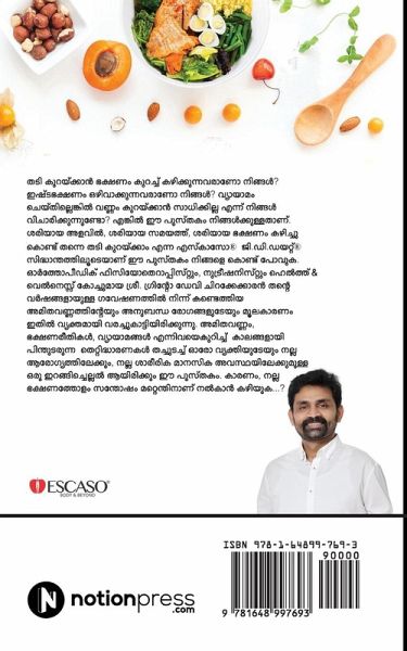 Are you afraid of eating food at a wedding or a banquet because of your diet plans? Do you eat less to reduce your weight? Do you still think that if you don't exercise you will get fatter? If so, this book is for you. This book takes you through the ESCASO(R) GDDiET(R) principles which says that you can reduce your weight by eating the right amount of food at the right time and at the right time. Mr Grindo Davey Chirakekaran, an orthopedic physiotherapist, Nutritionist and Health & Wellness Coach, has clearly outlined the root causes of obesity and related illnesses from his years of research. This book is a journey into the good health and good health of every person by overcoming the age-old misconceptions about obesity, diet, and exercise. Because all love to eat good foods.