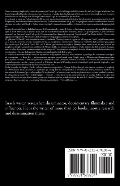 Dans cet ouvrage, j'explique les visions du prophète juif Daniel, qui a vécu à l'époque de la déportation des Juifs par l'Empire babylonien. Son livre n'est pas abordé par les rabbins dans leurs études ; en revanche, dans l'eschatologie chrétienne, ses uvres sont pleinement présentes, mais fondées sur une longue série d'interprétations erronées qui ne correspondent pas aux faits. La vision de la statue de Nabuchodonosor II, qui voit les grands empires qui s'établiraient dans le monde, à commencer par le sien (le babylonien), sous la forme de la tête dorée de la statue. Puis la vision des 4 bêtes (chap. 4). Cette prophétie nécessite les informations données plus tard aux scribes juifs Baruk et Esdras, où sont expliquées les questions de ces bêtes et du quatrième royaume, celui qui change jusqu'à la fin. Ensuite, la vision du bouc et du bélier (chapitre 8). Comme dans les visions de Daniel et d'après ce que nous savons des récits hellénistiques, après la mort d'Alexandre, le pouvoir passa, non pas à ses héritiers (qui furent assassinés), mais à ses quatre généraux. Cette histoire est complétée par d'autres récits juifs tels que les Chroniques des Maccabées et les uvres de l'historien juif Titus Flavius ¿¿Josèphe. C'est ce qu'on appelle aussi la première Abomination de la Désolation, instiguée par Antiochus IV Épiphane. L'explication de Daniel 9 suivrait ces événements. La vision de 70 conspirations se rapportant à l'époque de Daniel jusqu'à la destruction de la Judée. Le prophète apprend comment sept de ces conspirations seront menées à bien pour rétablir les Juifs dans leur pays depuis l'époque du règne de Cyrius le Grand. Plus tard, le Messie apparaîtrait et accomplirait 63 conjurations, mais il serait tué puis retiré de son peuple. Ses disciples accompliraient une Nouvelle Alliance établie par lui avant et pendant la révolte militaire des Juifs contre les Romains, dont les effets dévastateurs commenceraient avec les troupes de Titus détruisant le temple (la dernière Abomination de la Désolation) et se termineraient à l'époque de l'empereur Hadrien, qui expulserait les Juifs de leur terre. La vision d'un royaume du nord contre un royaume du sud (chapitres 10 et 11). Voici la version la plus large des événements historiques de cette époque - et de ce livre - qui commencent par cette guerre brutale entre l'Empire perse et l'Empire macédonien, progressant pour humilier les Perses et divisant le pouvoir d'Alexandre le Grand à Séleucos, Ptolémée, Cassandre et Lysimaque. En conclusion, toutes ces confrontations guerrières commencèrent à se désintégrer lorsque la République romaine fut éclipsée par le pouvoir impérial, et ainsi commença l'expansionnisme et le désir de conquête des Césars. Enfin, le mystère du chapitre 12 et les malentendus qui se sont produits à l'époque de Jésus, lorsqu'il a de nouveau mentionné la prophétie de l'Abomination de la Désolation. La confusion qui a surgi dans les jours précédant la crucifixion de Yeshua, lorsqu'il a mentionné la destruction de Jérusalem (qui a eu lieu quelque 30 ans plus tard), car la conversation impliquait plusieurs sujets, certains sans lien les uns avec les autres, mais les interprètes eschatologiques croyaient - comme beaucoup de ceux présents qui ont entendu Yeshua à l'époque - qu'il faisait référence à une série d'événements qui auraient lieu dans la même période de temps. Le récit de la Grande Tribulation est largement développé dans mon ouvrage La Grande Tribulation, Apocalypse - Vision à Distance .