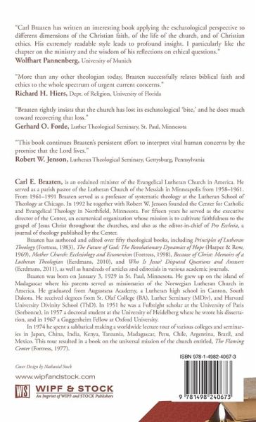 ""Carl Braaten has written an interesting book applying the eschatological perspective to different dimensions of the Christian faith, of the life of the church, and of Christian ethics. His extremely readable style leads to profound insight. I particularly like the chapter on the ministry and the wisdom of his reflections on ethical questions."" Wolfhart Pannenberg, University of Munich ""More than any other theologian today, Braaten successfully relates biblical faith and ethics to the whole spectrum of urgent current concerns."" Richard H. Hiers, Dept. of Religion, University of Florida ""Braaten rightly insists that the church has lost its eschatological 'bite,' and he does much toward recovering that loss."" Gerhard O. Forde, Luther Theological Seminary, St. Paul, Minnesota ""This book continues Braaten's persistent effort to interpret vital human concerns by the promise that the Lord lives."" Robert W. Jenson, Lutheran Theological Seminary, Gettysburg, Pennsylvania Carl Edward Braaten is an ordained minister of the Evangelical Lutheran Church in America. He served as a parish pastor of the Lutheran Church of the Messiah in Minneapolis from 1958-1961. From 1961-1991 Braaten served as a professor of systematic theology at the Lutheran School of Theology at Chicago. In 1992 he together with Robert W. Jenson founded the Center for Catholic and Evangelical Theology in Northfield, Minnesota. For fifteen years he served as the executive director of the Center, an ecumenical organization whose mission is to cultivate faithfulness to the gospel of Jesus Christ throughout the churches, and also as the editor-in-chief of Pro Ecclesia, a journal of theology published by the Center. Braaten has authored and edited over fifty theological books, including Principles of Lutheran Theology (Fortress, 1983), The Future of God: The Revolutionary Dynamics of Hope (Harper & Row, 1969), Mother Church: Ecclesiology and Ecumenism (Fortress, 1998), Because of Christ: Memoirs of a Lutheran Theologian (Eerdmans, 2010), and Who Is Jesus? Disputed Questions and Answers (Eerdmans, 2011), as well as hundreds of articles and editorials in various academic journals. Braaten was born on January 3, 1929 in St. Paul, Minnesota. He grew up on the island of Madagascar where his parents served as missionaries of the Norwegian Lutheran Church in America. He graduated from Augustana Academy, a Lutheran high school in Canton, South Dakota. He received degrees from St. Olaf College (BA), Luther Seminary (MDiv), and Harvard University Divinity School (ThD). In 1951 he was a Fulbright scholar at the University of Paris (Sorbonne), in 1957 a doctoral student at the University of Heidelberg where he wrote his dissertation, and in 1967 a Guggenheim Fellow at Oxford University. In 1974 he spent a sabbatical making a worldwide lecture tour of various colleges and seminaries in Japan, China, India, Kenya, Tanzania, Madagascar, Peru, Chile, Argentina, Brazil, and Mexico. This tour resulted in a book on the universal mission of the church entitled, The Flaming Center (Fortress, 1977).