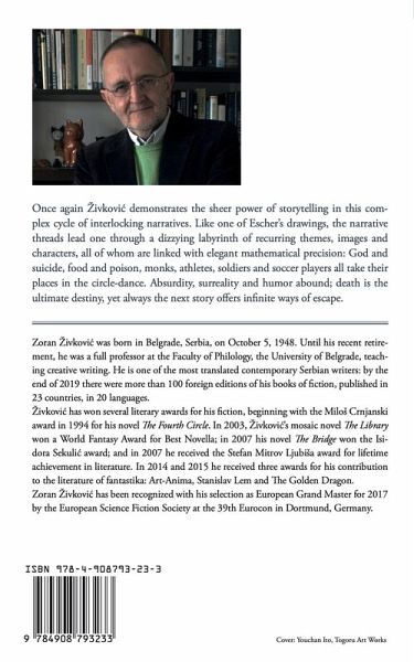 Once again Zivkovic demonstrates the sheer power of storytelling in this complex cycle of interlocking narratives. Like one of Escher’s drawings, the narrative threads lead one through a dizzying labyrinth of recurring themes, images and characters, all of whom are linked with elegant mathematical precision: God and suicide, food and poison, monks, athletes, soldiers and soccer players all take their places in the circle-dance. Absurdity, surreality and humor abound; death is the ultimate destiny, yet always the next story offers infinite ways of escape.