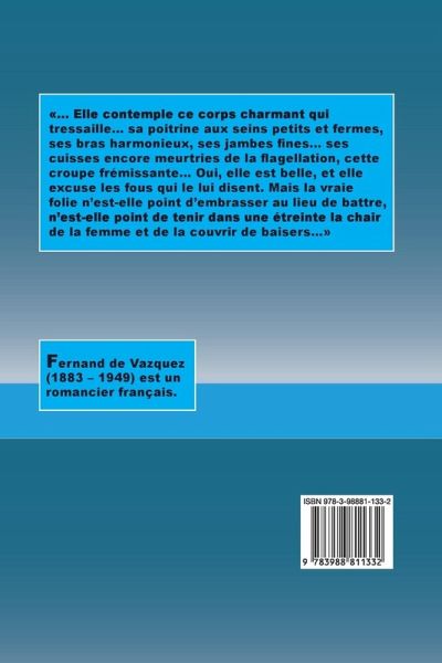 ... Elle contemple ce corps charmant qui tressaille... sa poitrine aux seins petits et fermes, ses bras harmonieux, ses jambes fines... ses cuisses encore meurtries de la flagellation, cette croupe frémissante... Oui, elle est belle, et elle excuse les fous qui le lui disent. Mais la vraie folie n'est-elle point d'embrasser au lieu de battre, n'est-elle point de tenir dans une étreinte la chair de la femme et de la couvrir de baisers...