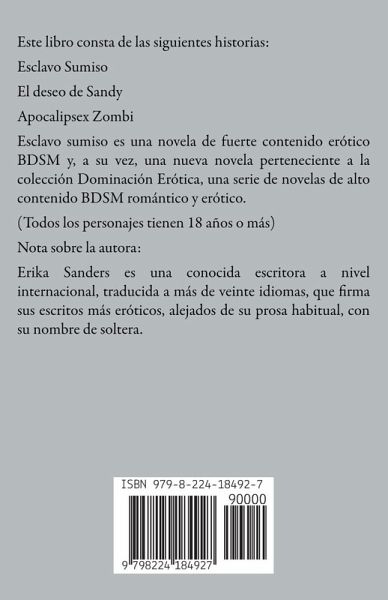 Este libro consta de las siguientes historias: Esclavo Sumiso El deseo de Sandy Apocalipsex Zombi Esclavo sumiso es una novela de fuerte contenido erótico BDSM y, a su vez, una nueva novela perteneciente a la colección Dominación Erótica, una serie de novelas de alto contenido BDSM romántico y erótico. (Todos los personajes tienen 18 años o más) Nota sobre la autora: Erika Sanders es una conocida escritora a nivel internacional, traducida a más de veinte idiomas, que firma sus escritos más eróticos, alejados de su prosa habitual, con su nombre de soltera.