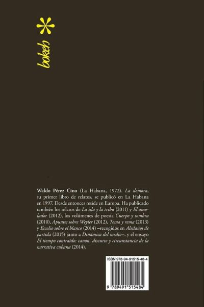 Waldo Pérez Cino (La Habana, 1972). La demora, su primer libro de relatos, se publicó en La Habana en 1997. Desde entonces reside en Europa. Ha publicado también los relatos de La isla y la tribu (2011) y El amolador (2012), los volúmenes de poesía Cuerpo y sombra (2010), Apuntes sobre Weyler (2012), Tema y rema (2013) y Escolio sobre el blanco (2014) -recogidos en Aledaños de partida (2015) junto a Dinámica del medio-, y el ensayo El tiempo contraído: canon, discurso y circunstancia de la narrativa cubana (2014).