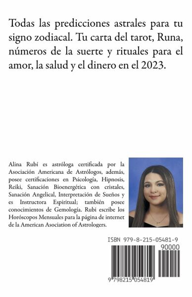 Alina Rubíiacute; es astróoacute;loga certificada por la Asociación Americana de Astrólogos, ademáaacute;s, posee certificaciones en Psicología, Hipnosis, Reiki, Sanación Bioenergéeacute;tica con cristales, Sanación Angelical, Interpretación de Sueñntilde;os y es Instructora Espiritual; también posee conocimientos de Gemología. Rubi escribe los Horóscopos Mensuales para la página de internet de la American Asociation of Astrologers, escribe semanalmente una columna en el diario El Nuevo Herald sobre temas de astrología y psicología publicada todos los viernes en forma digital y los lunes en el impreso. Tiene su propia columna digital sobre astrología en el periódico Diario las Américas, Rubí Astrologa. Rubí ha escrito varios artículos sobre astrología para la publicación mensual "Today's Astrologer", ha impartido clases de Astrología, Tarot, Lectura de las manos, Sanación con Cristales y Coaching Espiritual. Tiene un segmento en el canal de YouTube del Nuevo Herald todos los domingos acerca de astrología y temas de actualidad. Tuvo su propio programa de Astrología trasmitido diariamente a través de Flamingo TV, ha sido entrevistada por varios programas de TV y todos los años se publica su anuario con el horóscopo signo por signo y otros temas místicos interesantes. Ha escrito varios libros, todos publicados en Amazon, "Arroz y Frijoles para el Alma, Parte I y II" ?Dinero para todos los Bolsillos?, ?Rice and Beans for The Soul?, ?Salud para Todos los Corazones?, ?Clases de Astrología, aprendiendo con tu Carta Natal?, y ?Rituales para el 2022?, todos publicados en cinco idiomas. Actualmente reside en Miami, Florida.