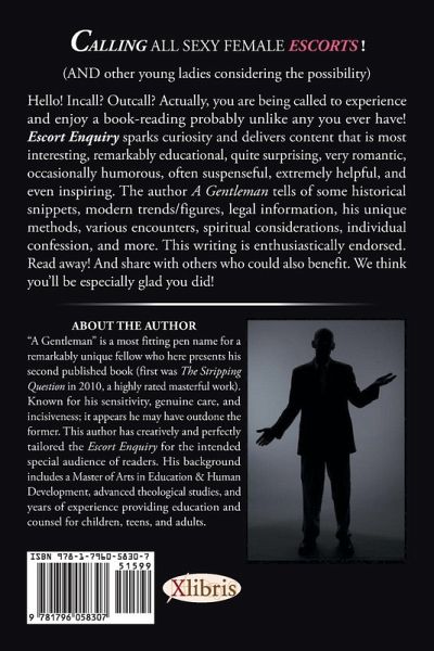 CALLING ALL SEXY FEMALE ESCORTS ! (AND other young ladies considering the possibility) Hello! Incall? Outcall? Actually, you are being called to experience and enjoy a book-reading probably unlike any you ever have! Escort Enquiry sparks curiosity and delivers content that is most interesting, remarkably educational, quite surprising, very romantic, occasionally humorous, often suspenseful, extremely helpful, and even inspiring. The author A Gentleman tells of some historical snippets, modern trends/figures, legal information, his unique methods, various encounters, spiritual considerations, individual confession, and more. This writing is enthusiastically endorsed. Read away! And share with others who could also benefit. We think you'll be especially glad you did!