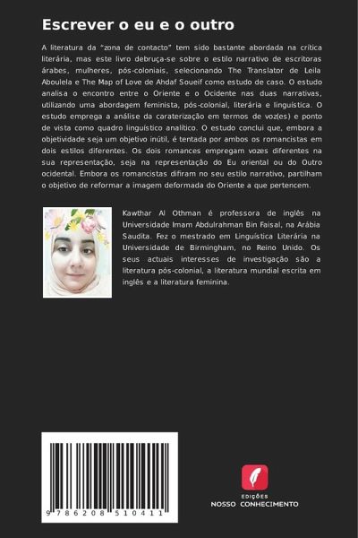 A literatura da "zona de contacto" tem sido bastante abordada na crítica literária, mas este livro debruça-se sobre o estilo narrativo de escritoras árabes, mulheres, pós-coloniais, selecionando The Translator de Leila Aboulela e The Map of Love de Ahdaf Soueif como estudo de caso. O estudo analisa o encontro entre o Oriente e o Ocidente nas duas narrativas, utilizando uma abordagem feminista, pós-colonial, literária e linguística. O estudo emprega a análise da caraterização em termos de voz(es) e ponto de vista como quadro linguístico analítico. O estudo conclui que, embora a objetividade seja um objetivo inútil, é tentada por ambos os romancistas em dois estilos diferentes. Os dois romances empregam vozes diferentes na sua representação, seja na representação do Eu oriental ou do Outro ocidental. Embora os romancistas difiram no seu estilo narrativo, partilham o objetivo de reformar a imagem deformada do Oriente a que pertencem.