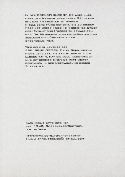 Satirisch humorvolle Menschenkritik, wie sieht ein Esel, als harmonisch lebendes Säugetier, die total verrückte Welt der Menschen. In der ESELSPHILOSOPHIE wird klar, daß der Mensch zwar jenes Säugetier ist, das am ehesten zur Intelligenz fähig scheint, bis zu diesem Prädikat jedoch noch ein schönes Stück des (Evolutions-) Weges zu bewältigen hat. Die Menschen sind die klügsten und zugleich die dümmsten aller Erdenbewohner. Wer bei der Lektüre der ESELSPHILOSOPHIE das Schmunzeln nicht vergißt, vielleicht sogar auch lachen kann, hat sie voll verstanden und ist bereits einen Schritt weiter gekommen in der Überwindung dieses Zustandes. Niemand, der dieses Buch gelesen hat, kann die Welt jemals wieder so sehen, wie er das vorher getan hat.