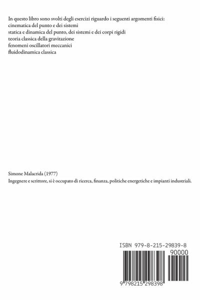 In questo libro sono svolti degli esercizi riguardo i seguenti argomenti fisici: cinematica del punto e dei sistemi statica e dinamica del punto, dei sistemi e dei corpi rigidi teoria classica della gravitazione fenomeni oscillatori meccanici fluidodinamica classica