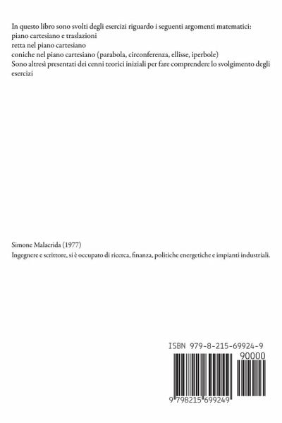 In questo libro sono svolti degli esercizi riguardo i seguenti argomenti matematici: piano cartesiano e traslazioni retta nel piano cartesiano coniche nel piano cartesiano (parabola, circonferenza, ellisse, iperbole) Sono altresì presentati dei cenni teorici iniziali per fare comprendere lo svolgimento degli esercizi