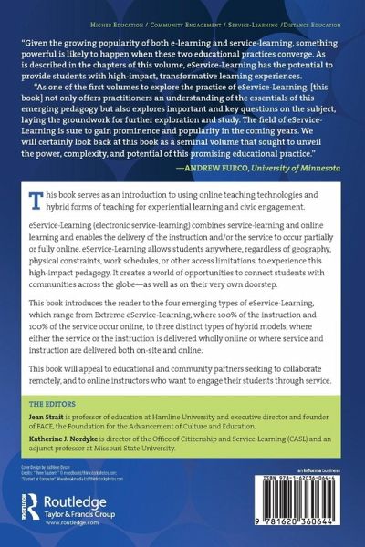 "This book is to be commended for articulating a rationale for including outcomes related to civic engagement and service-learning in higher education and best practices for using online technologies to implement eService-Learning in courses and curricula. A conspicuous strength is the description of various eService-Learning models. As such, the volume is particularly valuable for faculty and administrators in higher education."