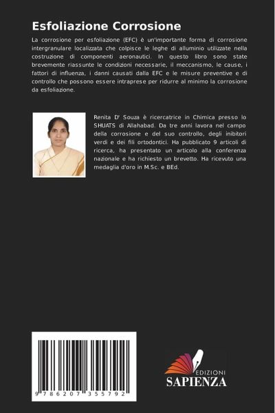 La corrosione per esfoliazione (EFC) è un'importante forma di corrosione intergranulare localizzata che colpisce le leghe di alluminio utilizzate nella costruzione di componenti aeronautici. In questo libro sono state brevemente riassunte le condizioni necessarie, il meccanismo, le cause, i fattori di influenza, i danni causati dalla EFC e le misure preventive e di controllo che possono essere intraprese per ridurre al minimo la corrosione da esfoliazione.