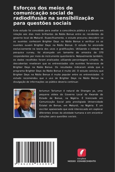 Este estudo foi concebido para avaliar a consciência pública e a atitude em relação aos dias mais brilhantes da Rádio Benue entre os residentes do governo local de Makurdi. Especificamente, o estudo procurou descobrir se os ouvintes conhecem Brighter Days na Rádio Benue e verificar se os ouvintes ouvem Brighter Days na Rádio Benue. O estudo foi ancorado exclusivamente na teoria dos usos e gratificações. Utilizando o método de pesquisa survey, foi alcançado um tamanho de amostra de 370 respondentes por meio do instrumento questionário. Notavelmente também, os dados recolhidos foram analisados ¿¿utilizando percentagens simples. As descobertas revelaram que os entrevistados são ouvintes fervorosos de Brighter Days na Rádio Benue. Os resultados indicaram ainda que o programa Brighter Days da Rádio Benue é muito útil. O estudo concluiu que Brighter Days na Rádio Benue é muito popular entre os entrevistados. O estudo recomendou que o uso de Brighter Days na Rádio Benue na divulgação de informações ao público deveria continuar.