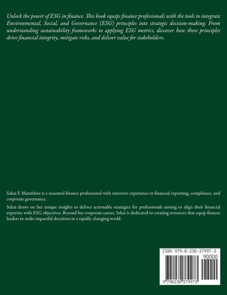 Unlock the power of ESG in finance. This book equips finance professionals with the tools to integrate Environmental, Social, and Governance (ESG) principles into strategic decision-making. From understanding sustainability frameworks to applying ESG metrics, discover how these principles drive financial integrity, mitigate risks, and deliver value for stakeholders. Whether you're a seasoned executive or starting your ESG journey, this guide will help you future-proof your role in an evolving global economy.