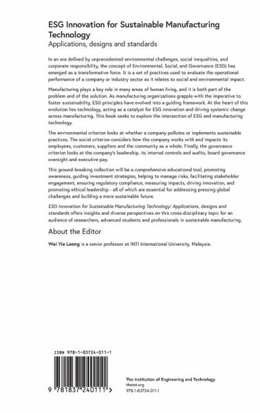As manufacturing organizations grapple with the imperative to foster sustainability, environmental, social, and governance (ESG) principles can be used as a guiding framework. This book seeks to explore the intersection of ESG and manufacturing technology.