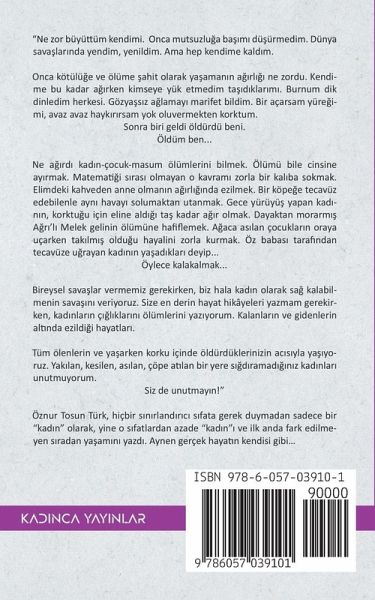 "Ne zor büyüttüm kendimi. Onca mutsuzlu¿a bä¿m¿ dü¿ürmedim. Dünya savälar¿nda yendim, yenildim. Ama hep kendime kald¿m. Onca kötülü¿e ve ölüme ¿ahit olarak yäaman¿n ä¿rl¿¿¿ ne zordu. Kendime bu kadar ä¿rken kimseye yük etmedim tä¿d¿klar¿m¿. Burnum dik dinledim herkesi. Gözyäs¿z älamay¿ marifet bildim. Bir açarsam yüre¿imi, avaz avaz hayk¿r¿rsam yok olu vermekten korktum. Sonra biri geldi öldürdü beni. Öldüm ben... Ne ä¿rd¿ kad¿n-çocuk-masum ölümlerini bilmek. Ölümü bile cinsine ay¿rmak. Matemati¿i s¿ras¿ olmayan o kavram¿ zorla bir kal¿ba sokmak. Elimdeki kahveden anne olman¿n ä¿rl¿¿¿nda ezilmek. Bir köpe¿e tecavüz edebilenle ayn¿ havay¿ solumaktan utanmak. Gece yürüyü¿ yapan kad¿n¿n, korktu¿u için eline ald¿¿¿ tä kadar ä¿r olmak. Dayaktan morarm¿¿ A¿r¿'l¿ Melek gelinin ölümüne hafiflemek. A¿aca as¿lan çocuklar¿n oraya uçarken tak¿lm¿¿ oldu¿u hayalini zorla kurmak. Öz babas¿ taraf¿ndan tecavüze u¿rayan kad¿n¿n yäad¿klar¿ deyip... Öylece kalakalmak... Bireysel savälar vermemiz gerekirken, biz hala kad¿n olarak sä kalabilmenin savä¿n¿ veriyoruz. Size en derin hayat hikâyeleri yazmam gerekirken, kad¿nlar¿n ç¿¿l¿klar¿n¿ ölümlerini yaz¿yorum. Kalanlar¿n ve gidenlerin alt¿nda ezildi¿i hayatlar¿. Tüm ölenlerin ve yäarken korku içinde öldürdüklerinizin ac¿s¿yla yä¿yoruz. Yak¿lan, kesilen, as¿lan, çöpe at¿lan bir yere s¿¿d¿ramad¿¿¿n¿z kad¿nlar¿ unutmuyorum. Siz de unutmay¿n!" Öznur Tosun Türk, hiçbir s¿n¿rland¿r¿c¿ s¿fata gerek duymadan sadece bir "kad¿n" olarak, yine o s¿fatlardan azade "kad¿n"¿ ve ilk anda fark edilmeyen s¿radan yäam¿n¿ yazd¿. Aynen gerçek hayat¿n kendisi gibi...