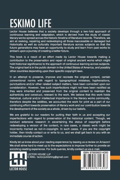 Eskimo Life: Translated By William Archer This book is a result of an effort made by us towards making a contribution to the preservation and repair of original classic literature. In an attempt to preserve, improve and recreate the original content, we have worked towards: 1. Type-setting & Reformatting: The complete work has been re-designed via professional layout, formatting and type-setting tools to re-create the same edition with rich typography, graphics, high quality images, and table elements, giving our readers the feel of holding a 'fresh and newly' reprinted and/or revised edition, as opposed to other scanned & printed (Optical Character Recognition - OCR) reproductions. 2. Correction of imperfections: As the work was re-created from the scratch, therefore, it was vetted to rectify certain conventional norms with regard to typographical mistakes, hyphenations, punctuations, blurred images, missing content/pages, and/or other related subject matters, upon our consideration. Every attempt was made to rectify the imperfections related to omitted constructs in the original edition via other references. However, a few of such imperfections which could not be rectified due to intentional\unintentional omission of content in the original edition, were inherited and preserved from the original work to maintain the authenticity and construct, relevant to the work. We believe that this work holds historical, cultural and/or intellectual importance in the literary works community, therefore despite the oddities, we accounted the work for print as a part of our continuing effort towards preservation of literary work and our contribution towards the development of the society as a whole, driven by our beliefs. We are grateful to our readers for putting their faith in us and accepting our imperfections with regard to preservation of the historical content. HAPPY READING!