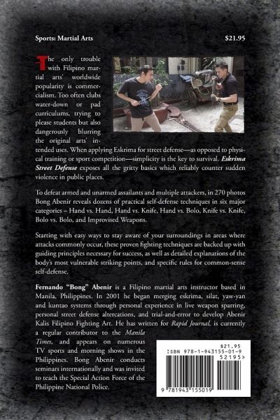 The only trouble with Filipino martial arts' worldwide popularity is commercialism. Too often clubs water-down or pad curriculums, trying to please students but also dangerously blurring the original arts' intended uses. When applying Eskrima for street defense-as opposed to physical training or sport competition-simplicity is the key to survival. Eskrima Street Defense exposes all the gritty basics which reliably counter sudden violence in public places. To ensure you can prevail against armed and unarmed assailants and multiple attackers, Bong Abenir reveals dozens of practical self-defense techniques in six major categories - Hand vs. Hand, Hand vs. Knife, Hand vs. Bolo, Knife vs. Knife, Bolo vs. Bolo, and Improvised Weapons. Starting with easy ways to stay aware of your surroundings in areas where attacks commonly occur, these proven fighting techniques are backed up with guiding principles necessary for success, as well as detailed explanations of the body's most vulnerable striking points, and specific rules for common-sense self-defense.