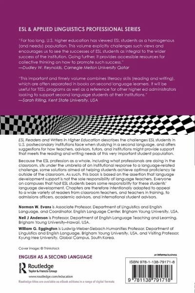 "This important and timely volume combines literacy skills (reading and writing), which are often separated in books on second language learners. It will be useful for TESL programs as well as a reference for other higher ed administrators looking to support second language students at their institutions."
