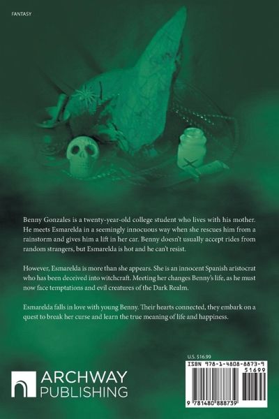Benny Gonzales is a twenty-year-old college student who lives with his mother. He meets Esmarelda in a seemingly innocuous way when she rescues him from a rainstorm and gives him a lift in her car. Benny doesn't usually accept rides from random strangers, but Esmarelda is hot and he can't resist. However, Esmarelda is more than she appears. She is an innocent Spanish aristocrat who has been deceived into witchcraft. Meeting her changes Benny's life, as he must now face temptations and evil creatures of the Dark Realm. Esmarelda falls in love with young Benny. Their hearts connected, they…mehr