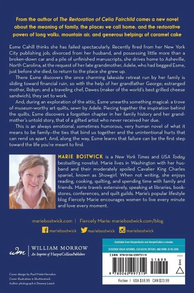 From the author of The Restoration of Celia Fairchild, comes a novel about the meaning of family and the places we call home. If you love “southern summer” fiction authors like Mary Alice Monroe and Kristy Woodson Harvey you’ll love this delicious novel about family, friendship, and finding your true path in life. Esme Cahill thinks she has failed spectacularly: fired from her New York City publishing job, divorced from her husband, and possessing little more than a broken-down car and a pile of unfinished manuscripts, she drives home to Asheville at the request of her late grandmother, Adele, who had begged her, just before she died, to return to the place she grew up. There she discovers the once-charming lakeside retreat run by her family is sliding toward financial ruin, so with the help of her grandfather, George; estranged mother, Robyn; and a travelling chef Dawes (maker of the world’s best grilled cheese sandwich) they set to work. In the attic, Esme unearths a trove of museum-worthy art quilts, sewn by Adele. Piecing together the inspiration behind them, Esme discovers a forgotten chapter in her family history and her grandmother’s untold story, that of a gifted artist who never received her due. This is an always-emotional, sometimes humorous, very human novel of what it means to be family—the ties that bind us together and the unintentional hurts that can rend us apart. And, along the way, Esme learns that failure can be the first step toward the life you’re meant to find.