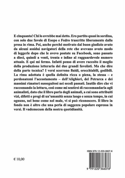 E cinquanta! Chi lo avrebbe mai detto. Ero partito quasi in sordina, con solo due favole di Esopo e Fedro trascritte liberamente dalla prosa in rima. Poi, anche perché motivato dal buon giudizio avuto da alcuni assidui navigatori della rete che avevano avuto modo di leggerle dopo che le avevo postate su Facebook, sono passato a dieci, quindi a venti, trenta e infine al ragguardevole numero attuale. E qui mi fermo. Infatti penso di avere raccolto il meglio della produzione letteraria dei due grandi favolisti. Ma che dire della parte tecnica? I versi scorrono fluidi, orecchiabili, godibili. La rima adottata è quella definita ricca o piena, la stessa - e perdonatemi l'accostamento - dell'Alighieri, del Petrarca e dei massimi rimatori susseguitosi nei secoli passati. Inutile dire che vi raccomando la lettura, così come mi sentirei di raccomandarla agli animalisti, dato che il libro parla degli animali, a cui sono attribuiti vizi, difetti e pregi di un'umanità senza luogo e senza tempo, in cui ognuno, nel bene come nel male, vi si può riconoscere. Il libro in fondo non è altro che una perla di saggezza popolare espressa in versi. Il vademecum della nostra quotidianità.