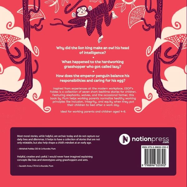 Why did the lion king make an owl his head of intelligence? What happened to the hard working grasshopper who got called lazy? How does the emperor penguin balance his responsibilities and caring for his egg? Inspired from experiences at the modern workplace, ESOP's Fables is a collection of seven short bedtime stories for children.Featuring elephants, wolves, and the occasional farmer, this book by Plum helps working parents normalize healthy working principles like inclusion, integrity, and equity with their children. Ideal for working adults and children aged 4-8.