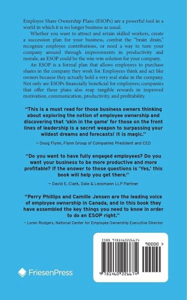 Perry Phillips From helping Canada's fastest growing companies implement engagement strategies to supporting business owners exiting on their terms, Perry Phillips is recognized as one of Canada's leading experts on employee share ownership plans (ESOPs). Perry is the president of ESOP Builders Inc., founder of the ESOP Association Canada and co-author of The Ten Trillion Dollar Opportunity: Designing Successful Exit Strategies for Middle Market Business Owners: A Guide for Professional Advisors - Canadian Edition. Camille Jensen Camille is the vice-president of ESOP Builders, Canada's leading designer of employee share ownership plans for private companies. In addition to helping companies implement ESOPs, Camille is an active volunteer with the ESOP Association Canada. Camille was a key organizer and chair of the first Canadian Employee Ownership Conference held in June, 2015 and writes frequently on ESOP issues.