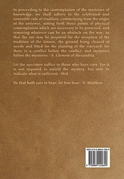 In proceeding to the contemplation of the mysteries of knowledge, we shall adhere to the celebrated and venerable rule of tradition, commencing from the origin of the universe, setting forth those points of physical contemplation which are necessary to be premised, and removing whatever can be an obstacle on the way; so that the ear may be prepared for the reception of the tradition of the Gnosis, the ground being cleared of weeds and fitted for the planting of the vineyard; for there is a conflict before the conflict, and mysteries before the mysteries.-S. Clement of Alexandria. Let the specimen suffice to those who have ears. For it is not required to unfold the mystery, but only to indicate what is sufficient.-Ibid.He that hath ears to hear, let him hear.-S. Matthew.