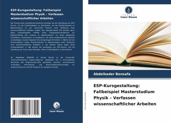 Der Einsatz eines kompetenzorientierten Ansatzes bei der Gestaltung von ESP-Kursen, um die Schwierigkeiten zu überwinden, auf die Physikstudenten im Masterstudium an der Universität Tlemcen beim Verfassen ihrer wissenschaftlichen Arbeiten stoßen. Das übergeordnete Ziel besteht darin, diese Schwierigkeiten mithilfe eines Triangulationsverfahrens zur Datenerhebung und -analyse zu diagnostizieren, um einen geeigneten Schreibkurs systematisch zu konzipieren. Um diese problematische Situation zu bewältigen, wurden folgende Forschungsfragen formuliert: 1. Welche Art von Schwierigkeiten haben Physikstudenten im Masterstudium beim Verfassen ihrer wissenschaftlichen Arbeiten? 2. Auf welcher Ebene liegen diese Schwierigkeiten? 3. Wie können die Ausbildung von ESP-Lehrern und die Gestaltung der Kurse dazu beitragen, diese Schwierigkeiten zu überwinden?