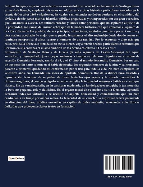 Faltome tiempo y espacio para referiros un suceso doloroso acaecido en la familia de Santiago Ibero. Si me dais licencia, emplearé mis ocios en adobar esta y otras historias particulares anotadas en la cuenta de los años 1869 y siguientes, las cuales a mi entender no deben perderse en el sumidero del olvido, a donde paran muchas historias públicas pregonadas y trompeteadas por esa gran voceadora que llamamos la Gaceta. Los íntimos enredos y lances entre personas, que no aspiraron al juicio de la posteridad, son ramas del mismo árbol que da la madera histórica con que armamos el aparato de la vida externa de los pueblos, de sus príncipes, alteraciones, estatutos, guerras y paces. Con una y otra madera, acopladas lo mejor que se pueda, levantamos el alto andamiaje desde donde vemos en luminosa perspectiva el alma, cuerpo y humores de una nación... Por lo expuesto, y algo más que callo, pedida la licencia, o tomada si no me la dieren, voy a referir hechos particulares o comunes que llevaron en sus entrañas el mismo embrión de los hechos colectivos. El caso es este: Primogénito de Santiago Ibero y de Gracia (la niña segunda de Castro-Amézaga) fue aquel ambicioso y desengañado joven cuyas andanzas a tiempo se relataron. Siguiole en el orden de sucesión Demetria Fernanda, nacida el 45, y el 47 vino al mundo Fernandito Demetrio. Por un caso de trasposición harto común en el habla doméstica, los segundos nombres de la niña y su hermanito pasaron a primeros, quedando así confirmados por el uso para toda la vida. No bien cumplidos los veintitrés años, era Fernanda una moza de opulenta hermosura, flor de la ibérica raza, traslado y reproducción femenina de su padre, de quien tenía los ojos negros y la mirada quemadora, la riqueza sanguínea, el cuerpo espigado, el andar resuelto, la terquedad aragonesa batida en el yunque riojano. Era de ventajosa talla; en las anchuras moderada, en las delgadeces recogida; la tez morenita, la boca no pequeña, roja y dulcísima. En el regazo moral de su madre y su tía Demetria, aprendió Fernanda todas las virtudes, y se revistió de aquella honestidad y comedimiento que tan bien cuadraban a su linaje por ambas ramas. La tenacidad de su carácter, la espiritual fuerza polarizada en dirección del bien, existían envueltas en capitas de dulce modestia, semejantes a las túnicas delicadas que protegen a ciertos frutos en formación.