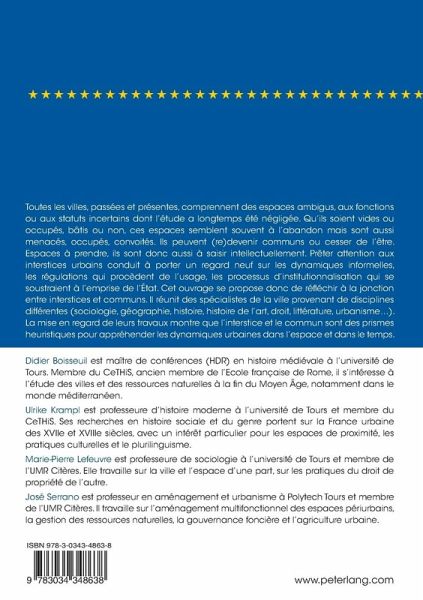 Didier Boisseuil est maître de conférences (HDR) en histoire médiévale à l'université de Tours. Membre du CeTHiS, ancien membre de l'Ecole française de Rome, il s'intéresse à l'étude des villes et des ressources naturelles à la fin du Moyen Âge, notamment dans le monde méditerranéen. Ulrike Krampl est professeure d'histoire moderne à l'université de Tours et membre du CeTHiS. Ses recherches en histoire sociale et du genre portent sur la France urbaine des XVIIe et XVIIIe siècles, avec un intérêt particulier pour les espaces de proximité, les pratiques culturelles et le plurilinguisme. Marie-Pierre Lefeuvre est professeure de sociologie à l'université de Tours. Elle travaille sur la ville et l'espace d'une part, sur les pratiques du droit de propriété de l'autre. José Serrano est professeur en aménagement et urbanisme à Polytech Tours. Il travaille sur l'aménagement multifonctionnel des espaces périurbains, la gestion des ressources naturelles, la gouvernance foncière et l'agriculture urbaine.