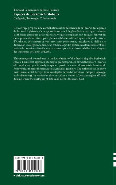 Cet ouvrage propose une contribution aux fondements de la théorie des espaces de Berkovich globaux. Cette approche récente à la géométrie analytique, qui mêle les théories classiques des espaces analytiques complexes et p-adiques, fournit un cadre géométrique naturel pour plusieurs théories arithmétiques, telle que la théorie d'Arakelov. Les auteurs suivent trois axes principaux, inexplorés au-delà de la dimension 1 : catégorie, topologie et cohomologie. En particulier, ils introduisent une notion de domaine affinoïde surconvergent, pour lequel sont valables les analogues des théorèmes de Tate et de Kiehl.