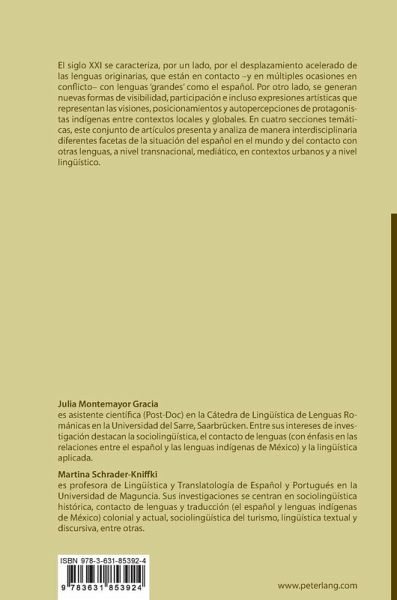 Julia Montemayor Gracia es asistente científica (Post-Doc) en la Cátedra de Lingüística de Lenguas Románicas en la Universidad del Sarre, Saarbrücken. Entre sus intereses de investigación destacan la sociolingüística, el contacto de lenguas (con énfasis en las relaciones entre el español y las lenguas indígenas de México) y la lingüística aplicada. Martina Schrader-Kniffki es profesora de Lingüística y Translatología de Español y Portugués en la Universidad de Maguncia. Sus investigaciones se centran en sociolingüística histórica, contacto de lenguas y traducción (el español y lenguas indígenas de México) colonial y actual, sociolingüística del turismo, lingüística textual y discursiva, entre otras.