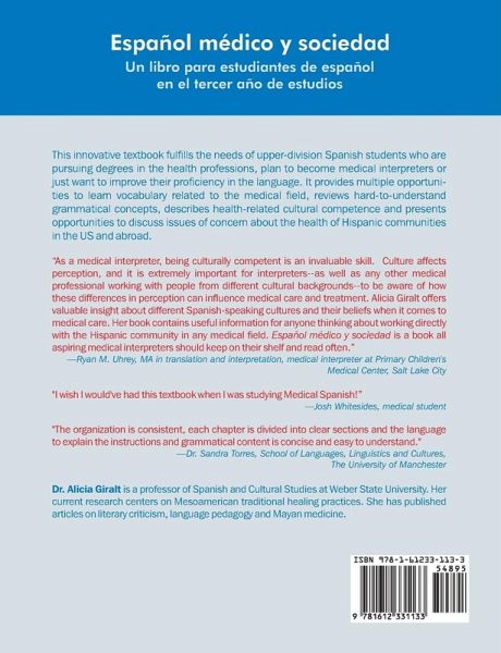 This innovative textbook fulfills the needs of upper-division Spanish students who are pursuing degrees in the health professions, plan to become medical interpreters or just want to improve their proficiency in the language. It provides multiple opportunities to learn vocabulary related to the medical field, reviews hard-to-understand grammatical concepts, describes health-related cultural competence and presents opportunities to discuss issues of concern about the health of Hispanic communities in the US and abroad.