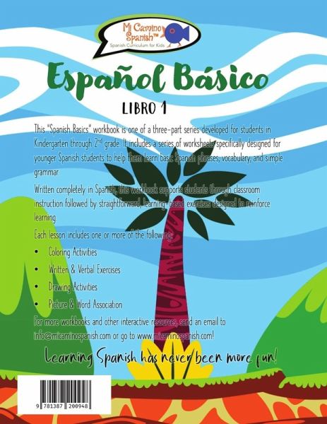"Español Básico" (Spanish Basics) by Mi Camino Spanish(TM) is a workbook created by a Spanish teacher specifically designed for elementary school students in grades Kindergarten - 1st. This workbook includes over 100 worksheets of "Spanish Basics" covering the following 10 lessons: 1. Greetings & Good-byes 2. Numbers, Alphabet, Colors & Shapes 3. The Calendar & Weather 4. Telling Time & School Vocabulary 5. Verbs & "Me Gusta" 6. Parts of the Body & Introduction to Animals 7. My Family 8. Introduction to Food 9. Where are you going? & What are you going to do? 10. Spanish-Speaking Countries of the World. This workbook is perfect to use with students in an immersion setting since all of the exercises are written completely in Spanish! To find out more about accessing additional multimedia resources, send an email to info@micaminospanish.com.