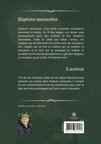 Espèces menacées, c¿est trente nouvelles d¿ambiance traversant le temps. Au fil des pages, ces textes vous transporteront dans des endroits et des situations étonnantes. Entre le crime qui côtoie l¿amour, les cowboys qui se retrouvent sur scène avec les musiciens, des couples qui se font et d¿autres qui se perdent, la naissance et la mort qui se partagent la vedette, le quotidien et l¿extraordinaire alternent au gré des intrigues. La musique, quant à elle, n¿est jamais loin !