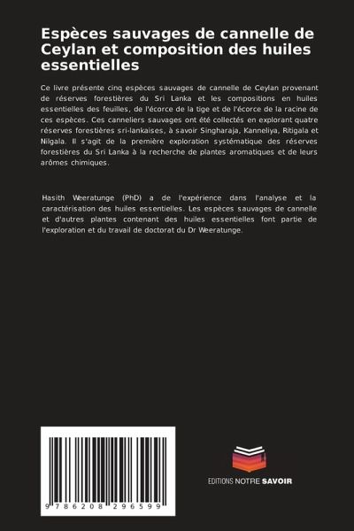 Ce livre présente cinq espèces sauvages de cannelle de Ceylan provenant de réserves forestières du Sri Lanka et les compositions en huiles essentielles des feuilles, de l'écorce de la tige et de l'écorce de la racine de ces espèces. Ces canneliers sauvages ont été collectés en explorant quatre réserves forestières sri-lankaises, à savoir Singharaja, Kanneliya, Ritigala et Nilgala. Il s'agit de la première exploration systématique des réserves forestières du Sri Lanka à la recherche de plantes aromatiques et de leurs arômes chimiques.