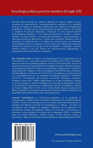 Mar Binimelis-Adell es Profesora del Departamento de Comunicación de la Universitat de Vic ¿ Universitat Central de Catalunya (UVic-UCC) y del Máster Interuniversitario de Estudios de Mujeres, Género y Ciudadanía (UB). Doctora en Comunicación por la Universidad Rovira i Virgili de Tarragona. Miembro del grupo de investigación TRACTE (Traducción Audiovisual, Comunicación y Territorio), del proyecto MYC (Mujeres y Cine) e investigadora del CEIG (Centro de Estudios Interdisciplinarios de Género de la UVic-UCC). Investigadora en el proyecto de I+D ¿Cartografías del cine de movilidad del Atlántico hispánicö (CSO2017-85290-P)¿. Coordinadora del proyecto Crossroads (European Comission. Erasmus+) entre otros. Publica regularmente en revistas académicas. Además de en torno al género, también investiga sobre otros ejes de desigualdad y poder en los medios de comunicación y audiovisuales. Ha sido investigadora visitante en Vassar College (Nueva York), en las Universidades Nacional Autónoma de México (UNAM) y Universidad Autónoma de la Ciudad de México (UACM) y en la Humboldt-Universität de Berlín entre otras instituciones. Amarela Varela-Huerta es Profesora/investigadora en la academia de Comunicación y Cultura de la Universidad Autónoma de la Ciudad de México (UACM). Doctora en Sociología por la Universidad Autónoma de Barcelona. Es miembro del Sistema Nacional de Investigadores en México. Las líneas de investigación que configuran su quehacer académico son la migración y los movimientos sociales. Ha publicado el libro Por el derecho a permanecer y a pertenecer, una sociología de la lucha de los migrantes (2013) y coordinado junto con Sandro Mezzadra y Blanca Cordero el libro América Latina en movimiento. Migraciones, límites a la movilidad y sus desbordamientos (2019).
