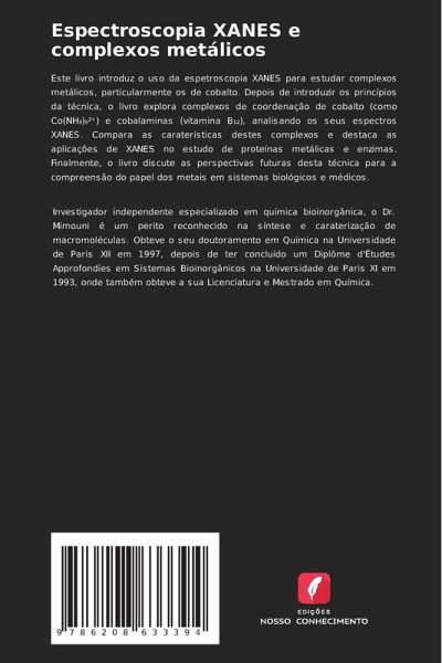 Este livro introduz o uso da espetroscopia XANES para estudar complexos metálicos, particularmente os de cobalto. Depois de introduzir os princípios da técnica, o livro explora complexos de coordenação de cobalto (como Co(NH¿)¿²¿) e cobalaminas (vitamina B¿¿), analisando os seus espectros XANES. Compara as caraterísticas destes complexos e destaca as aplicações de XANES no estudo de proteínas metálicas e enzimas. Finalmente, o livro discute as perspectivas futuras desta técnica para a compreensão do papel dos metais em sistemas biológicos e médicos.
