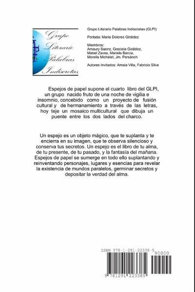 Espejos de papel supone el cuarto libro del GLPI, un grupo nacido fruto de una noche de vigilia e insomnio, concebido como un proyecto de fusión cultural y de hermanamiento a través de las letras, hoy teje un mosaico multicultural que dibuja un puente entre los dos lados del charco. Un espejo es un objeto mágico, que te suplanta y te encierra en su imagen, que te observa silencioso y conserva tus secretos. Un espejo es el libro de tu alma, de tu presente, de tu pasado, y la fantasía del mañana. Espejos de papel se sumerge en todo ello suplantando y reinventando personajes, lugares y esencias para revelar la existencia de mundos paralelos, germinar secretos y depositar la verdad del alma.